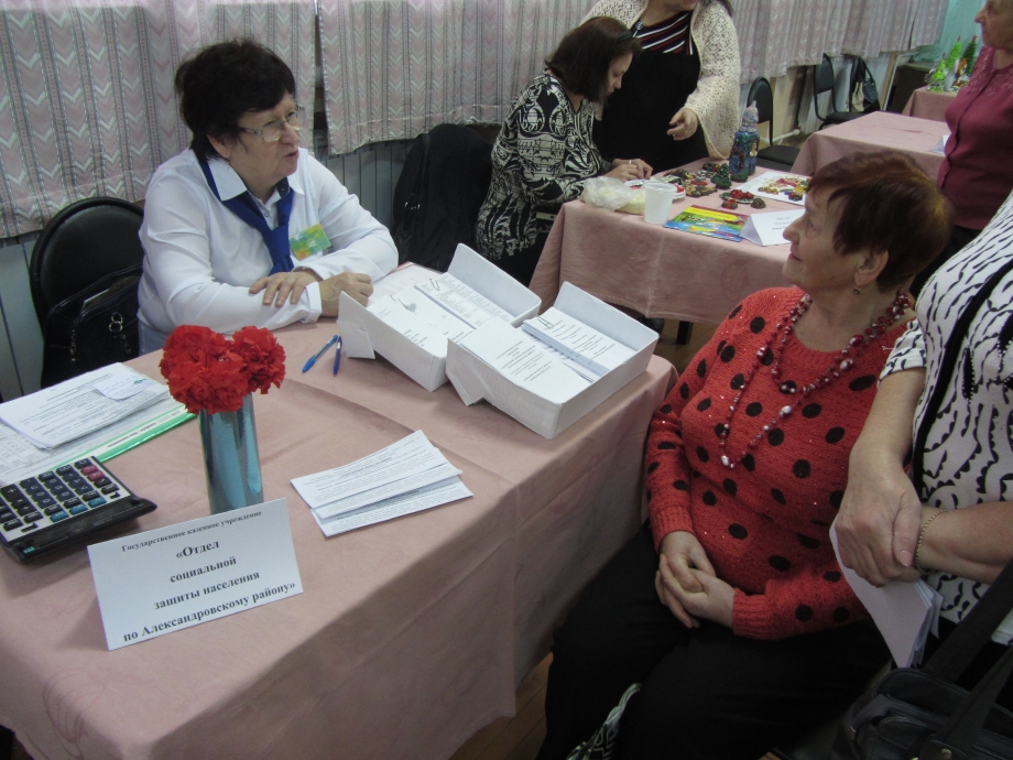 Перед началом торжественной части и концертной программой в фойе клуба прошло важное информативно-консультационное мероприятие. Представители значимых организации в жизни людей, кому нужна забота внимание и участие, рассказали о своей работе всем желающим, дали необходимые консультации, раздавали буклеты-памятки. Это – Отдел социальной защиты населения, Центр социального обслуживания, Центр помощи семье и детям, Пенсионный фонд, Центр занятости населения, Фонд социального страхования.
