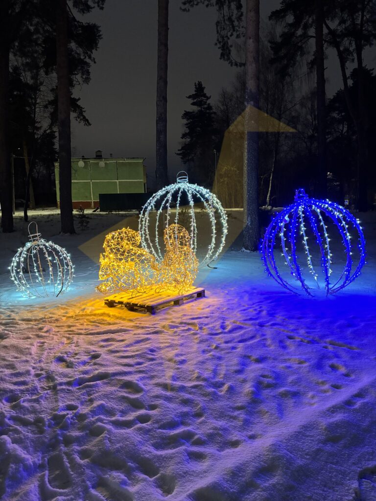 Парк преобразился: среди сосен засияли праздничные украшения, огоньки и декор, создавая настоящую зимнюю сказку.
