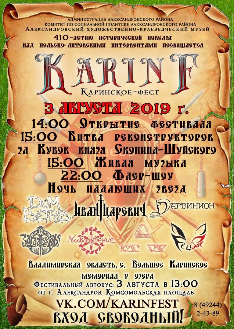 3 и 4 августа на Каринском поле состоится XI Межрегиональный историко-патриотический фестиваль "KarinF (Каринское фест)" - двухдневный музыкально-исторический фестиваль, с патриотической программой "Отчизны верные сыны", посвященный великой победе войска молодого князя-воеводы Скопина-Шуйского над польско-литовскими интервентами!