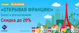 Пегас Туристик приглашает туристов в новый эксклюзивный экскурсионный тур «Открывая Францию» и дарит отличный бонус к ярким впечатлениям от программы: С 1 февраля 2016 г. скидка 20% на все заезды сезона «Лето 2016». «Открывая Францию» – это необычная авторская программа для тех, кто еще не бывал во Франции или бывал только в Париже, и хочет за одно путешествие увидеть самые интересные регионы страны, получить максимум впечатлений притом за разумную цену. Тур предлагает уникальный набор экскурсий: всего за неделю туристы смогут открыть для себя Париж и четыре легендарные французские провинции – Бургундию, Нормандию, Шампань и Долину Луары, посетить их знаменитые города, полюбоваться красотой замков и оценить качество вина именитых виноделен. В течение всей поездки ее участники будут размещаться только в одном комфортабельном апарт-отеле, удобно расположенном около Венсенского замка и парка, рядом со станцией метро, ведущей в центр Парижа. Авиаперелеты по программе будут выполняться регулярными рейсами авиакомпании Air France по субботам. Спешите бронировать! Первый заезд по туру состоится уже 2 апреля 2016 года. Не упустите возможность открыть Францию по выгодной цене! Звоните и заказывайте по телефонам:2-97-98,2-61-36 Наш адрес:г.Александров,ул.Институтская д 1 стр 5