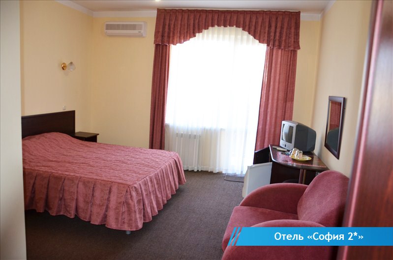 Четырехэтажное здание отеля «София» состоит из 32 номеров, рассчитанных на 64 места. В номере: две односпальные кровати или одна двуспальная кровать, прикроватные тумбочки, туалетный столик, стул, шкаф, полка для чемодана, телевизор, кондиционер, холодильник, бесплатный Wi-Fi. Санузел с душем.