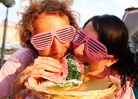 На улицах города гуляют тысячи людей, одетых по-праздничному, т.е. в розовое. Розовые футболки, шляпы, очки, носки, штаны, туфли, волосы... Розовые велосипедисты, мотоциклисты, автомобилисты... Каждый, отмечающий Летний новый год, имеет какой-либо атрибут соответствующего цвета.