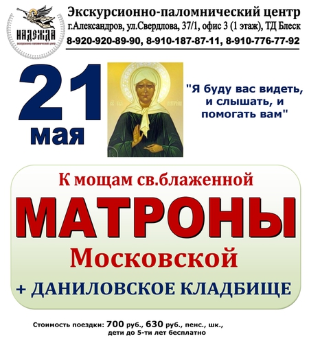 Приглашаем Вас 21 мая совершить поездку в г. Москву к мощам святой Матроны Московской Во время этой поездки вы сможете посетить Покровский ставропигиальный женский монастырь, где находятся мощи святой Матроны Московской и Даниловское кладбище, на котором была похоронена святая блаженная Матрона Московская. Могила святой остается местом поклонения и после перенесения мощей, люди несут цветы, в часовенке постоянно горят свечи. Святая блаженная Матрона Московская – одна из самых известных и почитаемых православных святых. Имевшая от рождения дар чудотворения, она ещё до кончины своей стала известна, как молитвенница и подвижница во славу Божью. Вся её жизнь стала примером великого духовного подвига любви, терпения, самоотречения и сострадания.При жизни Матронушки у ее дома всегда были паломники. Люди приезжали за помощью к матушке за десятки километров со своими болезнями, тревогами, скорбями. Матронушка помогала, исцеляла, наставляла. Поток паломников, чтобы приложиться к ее святых мощам, не иссякает и сегодня: с раннего утра до поздней ночи к Абельмановской заставе, где расположен Покровский ставропигиальный женский монастырь, идут люди с цветами. Перед смертью матушка Матрона сказала: «Все, все приходите ко мне и рассказывайте, как живой, о своих скорбях, я буду вас видеть, и слышать, и помогать вам». А еще матушка говорила, что все, кто доверит себя и жизнь свою ее ходатайству ко Господу, спасутся. «Всех, кто обращается ко мне за помощью, я буду встречать при их смерти, каждого». Стоимость поездки: 630 руб. пенс., шк., 700 руб. взр., дети до 5-ти лет б/п