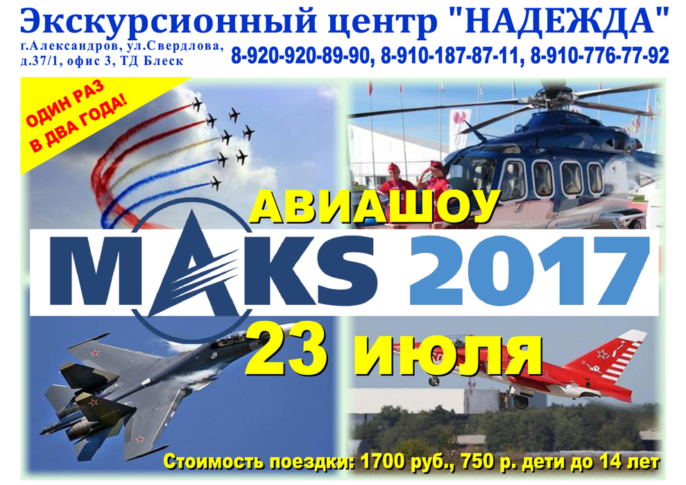 Самая красивая летная программа в мире. Вы нигде не увидите столько самолетов в небе как в Москве! Это потрясающий всенародный фестиваль авиации. Праздник, который всегда на высоте! Стоимость поездки: 1700 руб., 750 руб. дети до 14 лет