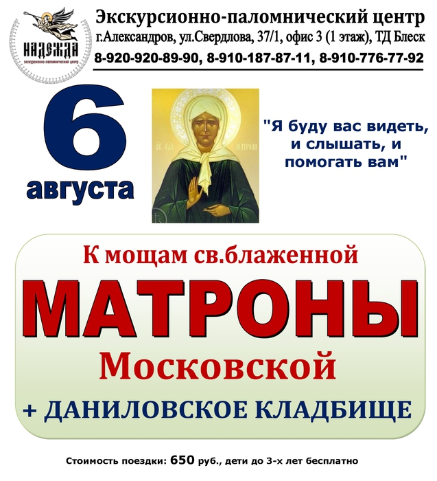 Приглашаем Вас 6 августа совершить поездку в г. Москву к мощам святой Матроны Московской. Во время этой поездки вы сможете посетить Покровский ставропигиальный женский монастырь, где находятся мощи святой Матроны Московской и Даниловское кладбище, где находится могилка святой. Стоимость поездки: 650 руб., дети до 3-х лет бесплатно