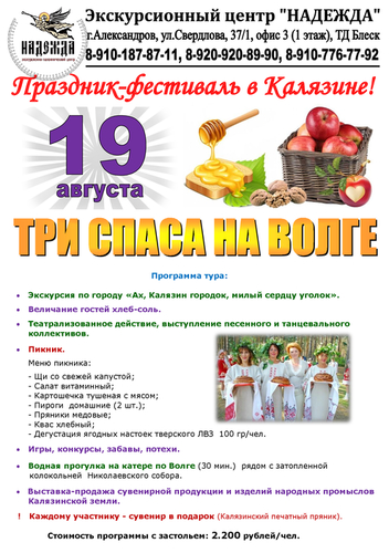 19 августа г.Калязин- туристический праздник-фестиваль "Три спаса на Волге"