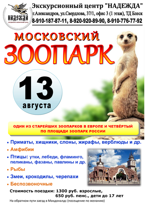 Приглашаем Вас и Ваших детей 13 августа в Московский зоопарк — один из самых больших и старейших зоопарков России.