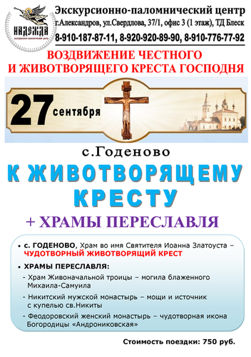 Дорогие друзья! 27 сентября, в праздник Воздвижения Креста Господня мы приглашаем вас присоединиться к паломнической поездке в Годеново. У Вас будет уникальная возможность приложиться к одной из самых почитаемых православных святынь – Животворящему Кресту Господню. В тихом живописном месте, вдали от городской суеты возвышается среди полей и лесов Ярославской земли храм во имя святителя Иоанна Златоуста в селе Годеново. Несмотря на значительную уединенность и отдаленность храма от транспортных развязок, не иссякает в это святое место поток паломников. Люди едут поклониться величайшей православной святыне – Животворящему Кресту Господню, чудесным образом явленному с неба в 1423 году. Многочисленные исцеления и помощи идут от Креста. В Годеново едут паломники со всего мира. На обратном пути посетим храмы и святыни Переславля.