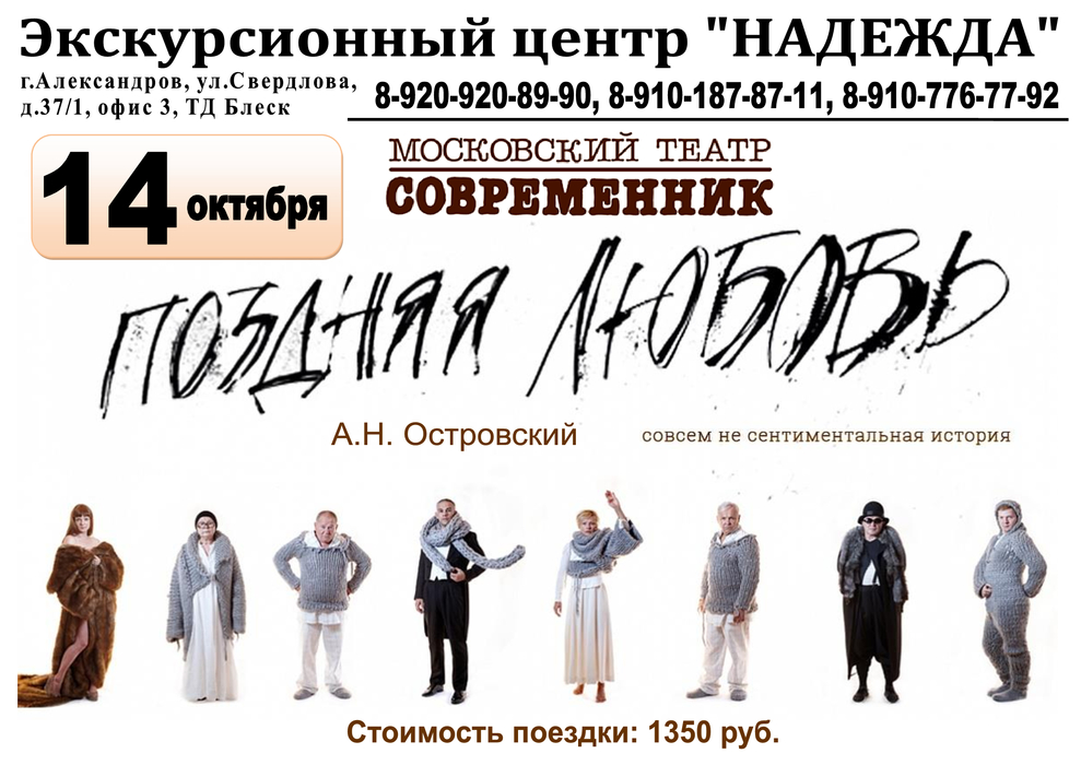 Театр " Современник" 14 октября Спектакль по пьесе А.Н.Островского "Поздняя любовь".