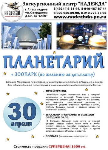 ПЛАНЕТАРИЙ + ЗООПАРК  (по желанию, за доп.плату) 30 апреля