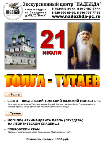 В этой поездке Вы сможете приложиться к нескольким святыням, хранящимся в Ярославской области - Толгской иконе Божией Матери, Частице Ризы Господней, мощам святителя Игнатия Брянчанинова, чудотворной иконе Богородицы "Прибавление ума". Так же мы с Вами побываем на могиле известного подвижника благочестия, старца Павла Груздева.