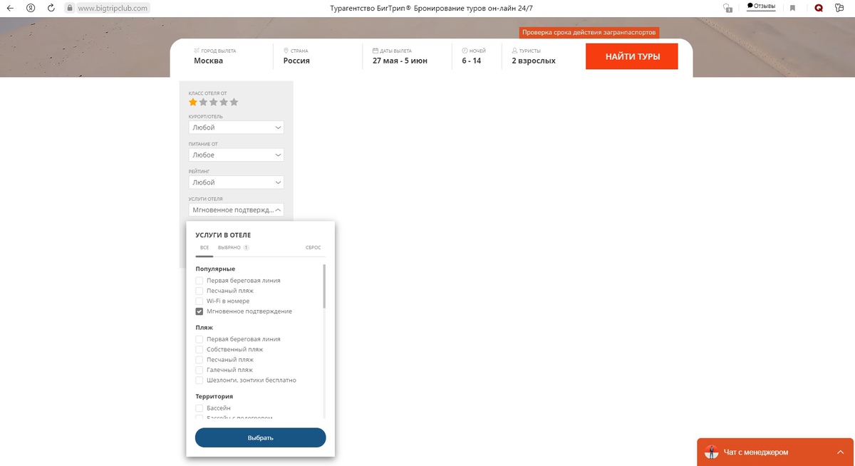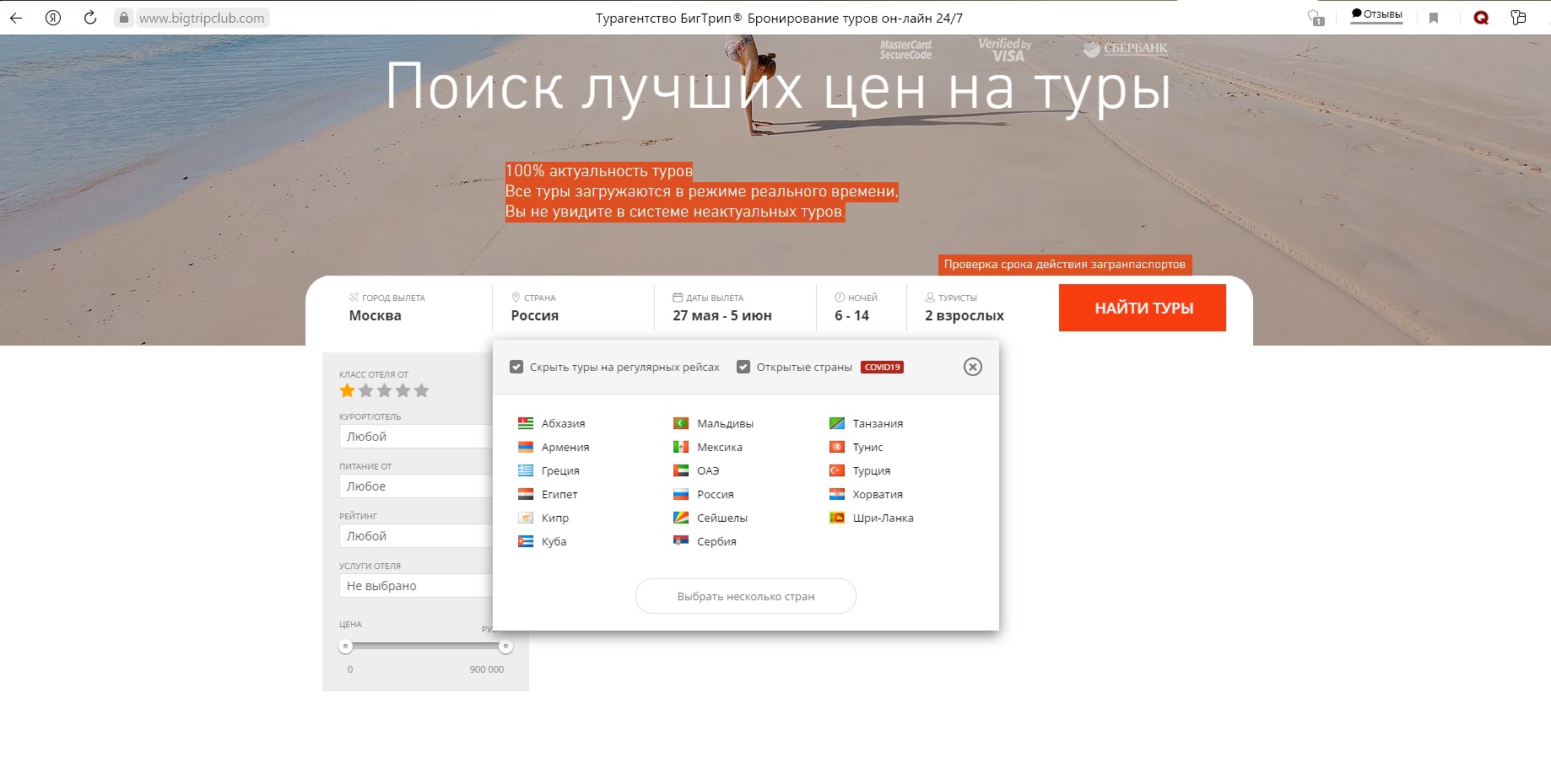 Дорогие туристы, на данный момент из-за большого спроса на курорты России и Абхазии, отели "под запрос" почти не подтверждаются, поэтому при поиске туров на нашем сайте www.bigtripclub.com советуем выбирать отели, номера в которых есть в наличии у тур оператора