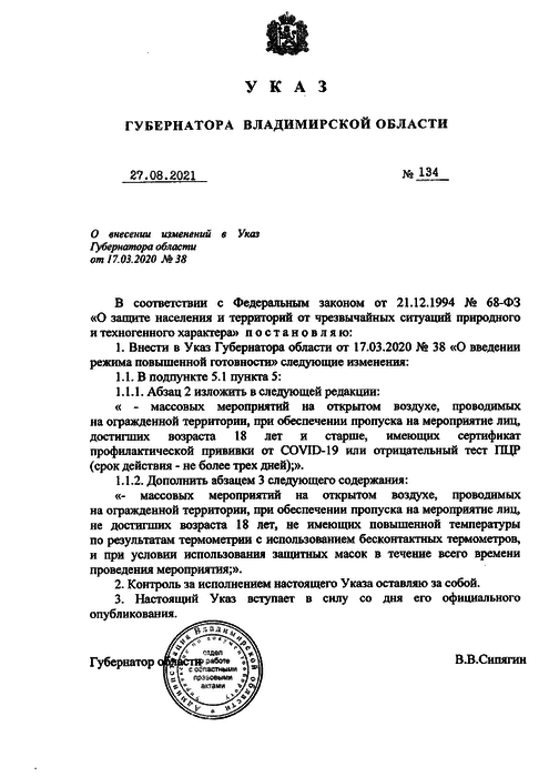 Указ Губернатора Владимирской области от 27.08.2021 № 134 "О внесении изменений в Указ Губернатора области от 17.03.2020 № 38"