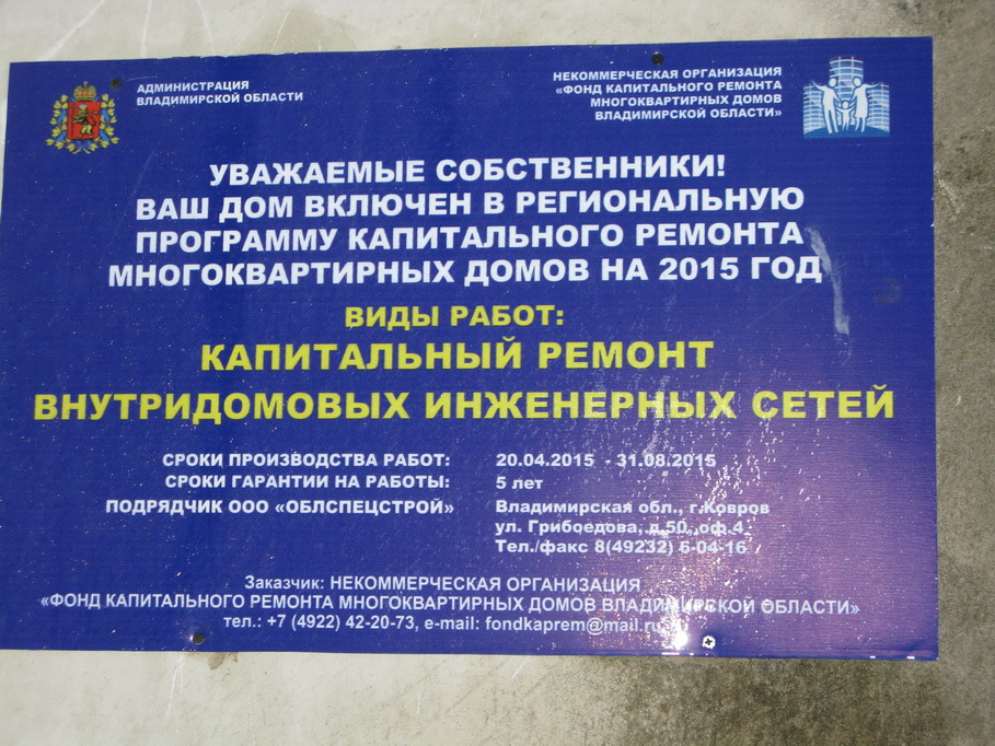 В ходе мониторинга активисты Народного фронта обращали внимание также на вопросы информационного сопровождения капремонта и участия жителей в контроле. Выяснилось, что во Владимире в ряде домов отсутствовали типовые таблички с необходимой информацией о графике ремонта, а на многих табличках, где они были, в графе «Срок выполнения работ» стоял прочерк. Большинство опрошенных общественниками жителей многоквартирных домов Владимира, где уже был проведен капремонт, говорили, что общих собраний жителей по обсуждению механизма ремонта, на которых должны были рассматриваться вопросы выбора и согласования проекта, сметы, графика и видов работ, участия представителей собственников в работе конкурсной комиссии по определению подрядчика и при приемке выполненных работ, не проводилось. Иную ситуацию активисты увидели в Коврове – здесь на домах есть и таблички с полной информацией, и старшие домов подтвердили проведение собраний и участие жителей в контроле за качеством работ.