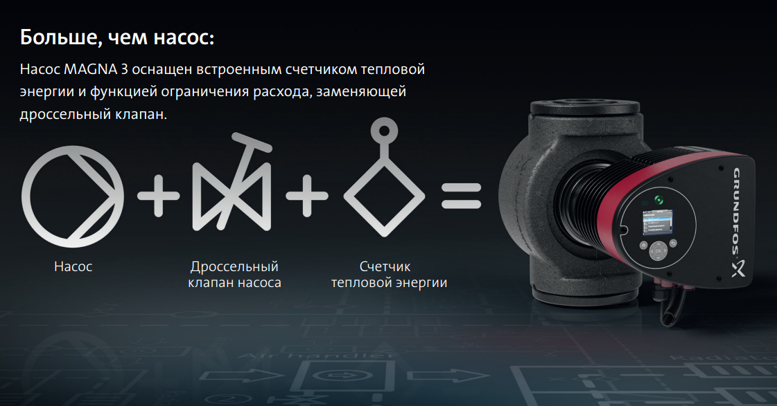 Циркуляционный насос Grundfos MAGNA3 - новинка 2016 года. В основу серии MAGNA3 положена испытанная технология MAGNA и непревзойденный опыт компании Grundfos в производстве Е-насосов. В комплектацию новой модели по-прежнему входит электродвигатель с постоянным магнитом, функция AUTOadapt и встроенный частотный преобразователь, однако новая серия оснащена некоторыми дополнительными, принципиально новыми функциями. Результатом работы инженеров стал инновационный насос, оснащенный "умными" технологиями и сохраняющий традиции непревзойденных показателей надежности Grundfos.