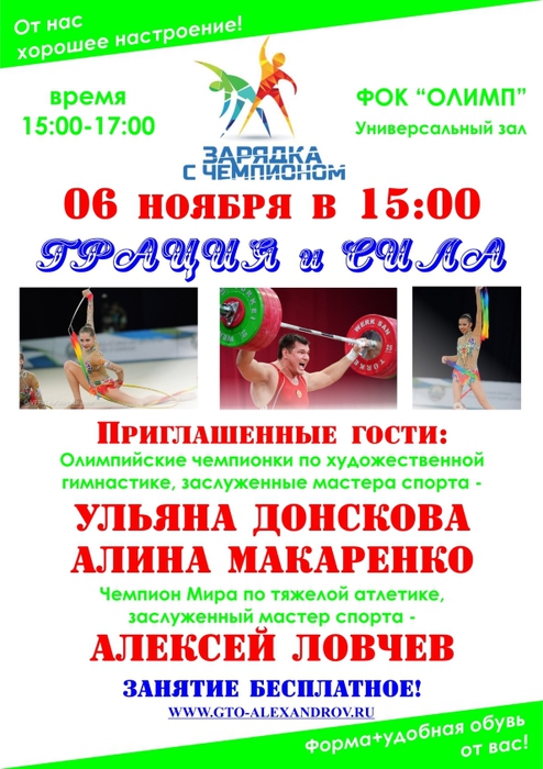 В это воскресенье 6 ноября с 15:00 до 17:00 в универсальном зале ФОК "Олимп" пройдёт "Зарядка с чемпионом"!!! ГРАЦИЯ и СИЛА - это стоит увидеть и конечно принять участие! Приглашенные гости: Олимпийские чемпионки по художественной гимнастике, заслуженные мастера спорта - УЛЬЯНА ДОНСКОВА и АЛИНА МАКАРЕНКО; Чемпион Мира по тяжелой атлетике,заслуженный мастер спорта - АЛЕКСЕЙ ЛОВЧЕВ!