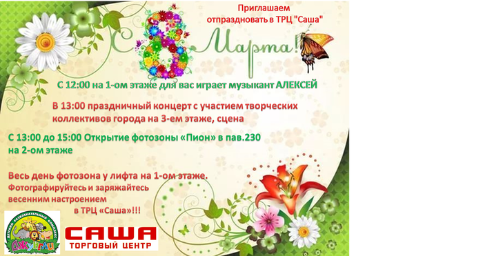 Приглашаем отпраздновать 8 марта в ТРЦ "Саша"