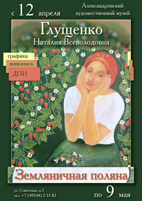 12 апреля, в 16:00, в Выставочном зале Александровского художественного музея откроется выставка Натальи Всеволодовны Глущенко под названием «Земляничная поляна».