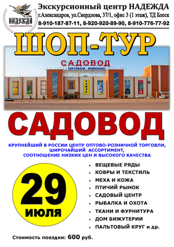 29 июля приглашаем в поездку на рынок Садовод г. Москва (бывший Черкизовский) Там вы можете приобрести, одежду и обувь по низким ценам, как для взрослых, так и для детей, бижутерию, парфюмерию, товары для дома, цветы, корма для животных, все для огорода и сада, чехлы на мобильные телефоны, зарядки, аккумуляторы, все для спорта.