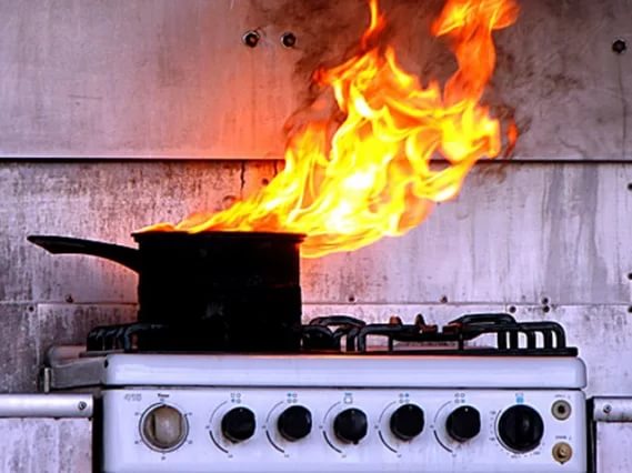 Если загорелось масло (в кастрюле, на сковороде), ни в коем случае не выливайте его в раковину и не заливайте водой: огонь может мгновенно распространиться по всей кухне. Не менее опасно тушить водой включенную электроплиту! Лучше перекройте подачу газа или электроэнергии, накройте посуду с горящим маслом мокрой тряпкой и подождите, пока масло не остынет. Иначе огонь может вспыхнуть вновь.
