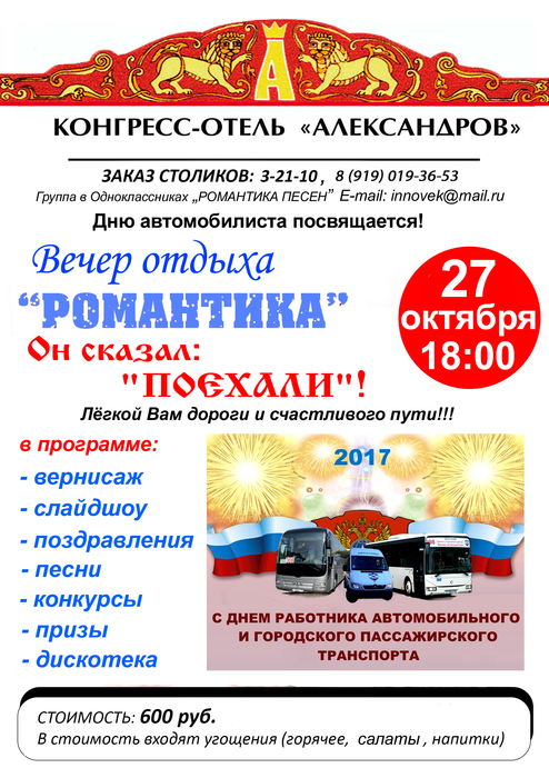 27 октября в 18.00 конгресс-отель "Александров" приглашает всех желающих посетить вечер Романтики. Тема романтического вечера "Он сказал: "поехали!"" (вечер посвящен работникам автомобильного и городского пассажирского автотранспорта). Заказ билетов по телефонам: 8(49244)3-21-10, 8(49244)2-29-65, 8(49244)2-59-01.