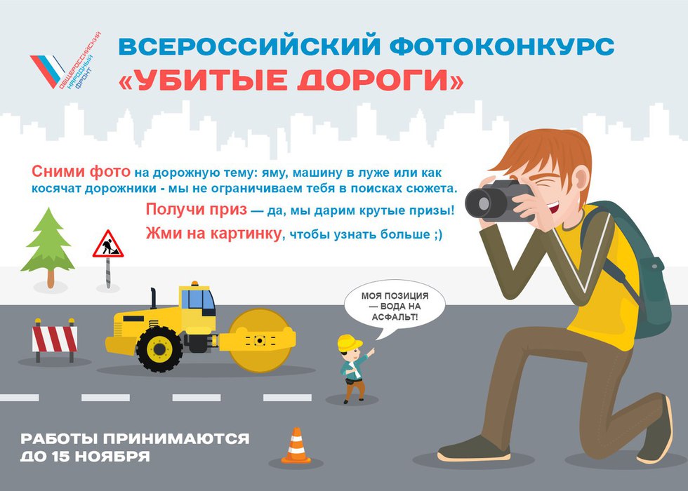 В соцсетях на страницах проекта «Дорожная инспекция ОНФ / Карта убитых дорог» 15 октября стартовал конкурс фотографий «Убитые Дороги». Его задача - привлечь молодых людей к теме качества местных дорог и безопасности дорожного движения. Участие в конкурсе могут принять фотографы и фотолюбители любого уровня квалификации, за победу их ждут призы – цифровые фотокамеры, а лучшие работы займут место на итоговой выставке. На данном этапе наибольшее количество снимков пришло на конкурс от жителей Центрального федерального округа и Поволжья. В Дальневосточном федеральном округе нашелся пока всего один недовольный местными дорогами фотограф.
