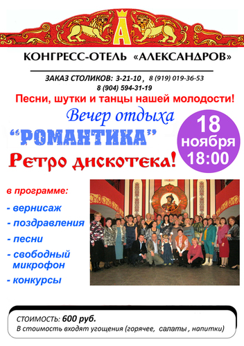 18 ноября в 18.00 конгресс-отель "Александров" приглашает всех желающих посетить вечер Романтики. Тема романтического вечера "Ретро дискотека!".
