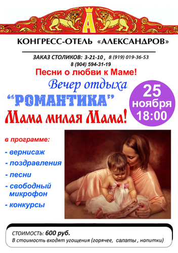 25 ноября в 18.00 конгресс-отель "Александров" приглашает всех желающих посетить вечер Романтики.