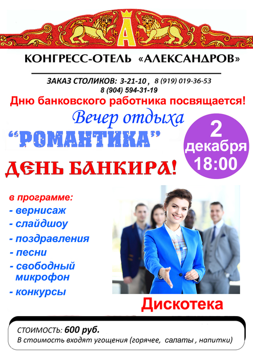 02 декабря в 18.00 конгресс-отель "Александров" приглашает всех желающих посетить вечер Романтики. Тема романтического вечера "ДЕНЬ БАНКИРА!".
