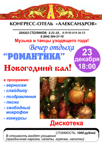 23 декабря  в 18.00 конгресс-отель "Александров" приглашает всех желающих посетить вечер Романтики. Тема романтического вечера "Новогодний бал!".