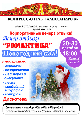 С 20 по 30 декабря  каждый день в 18.00 конгресс-отель "Александров" приглашает всех желающих посетить корпоративные вечера отдыха . Тема романтических вечеров "Новогодний бал!".