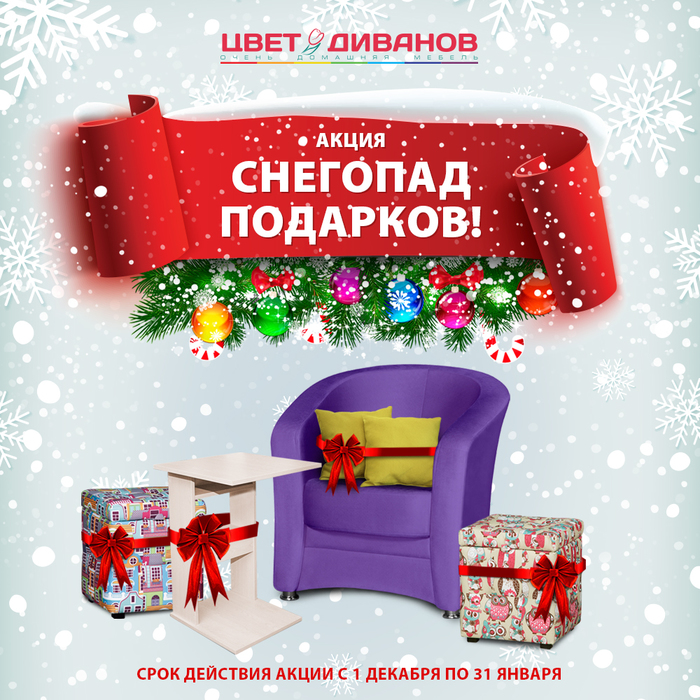 Рады сообщить, что в сети салонов мягкой мебели «Цвет Диванов» с 1 декабря 2017 года по 31 января 2018 года начинает действовать акция «Снегопад подарков».