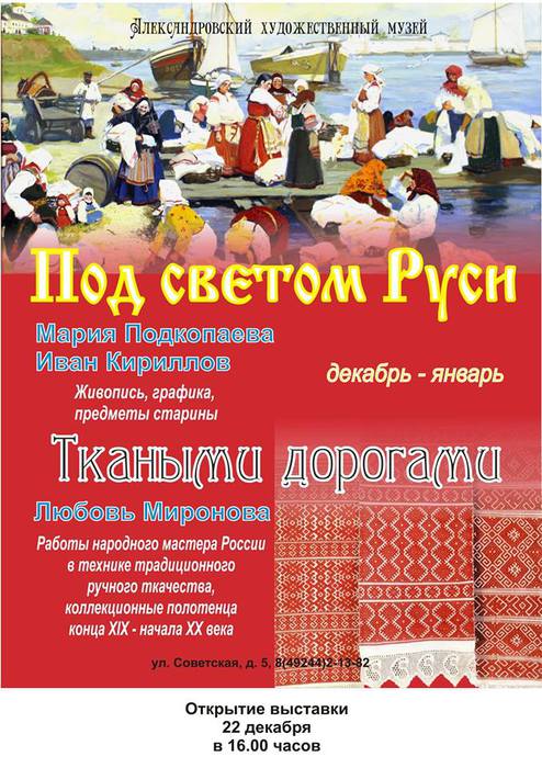 Уважаемые Александровцы и дорогие гости города! Приглашаем вас посетить выставку живописи художников реалистов Ивана Кириллова и Марии Подкопаевой "Под светом Руси". Иван и Мария ученики заслуженного художника России Ильи Сергеевича Глазунова. Вас ожидает увлекательное путешествие в прошлое нашей страны. Живописные виды города и его окрестностей подарят вам новый взгляд на красоту родного края. Экспозицию дополняют предметы старины из коллекции художников. Открытие выставки состоится 22 декабря в 16.00.