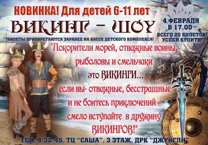 4 февраля впервые в городе детская игровая программа ВИКИНГ- ШОУ в ТРЦ "САША"