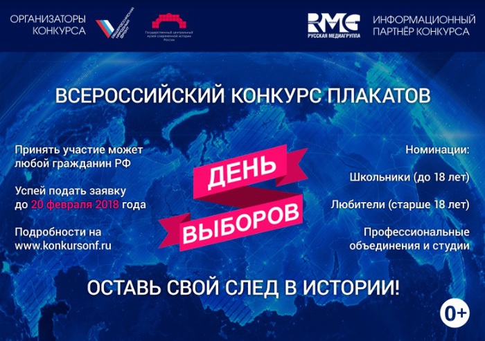 Накануне выборов Президента России Общероссийский народный фронт вместе с Музеем современной истории России запустил конкурс «День выборов» на лучший плакат на тему предстоящих выборов. Принять в нем участие может любой гражданин страны без возрастных ограничений, в том числе школьники. Лучшие работы будут выставлены в Музее современной истории России в Москве, а также получат призы.