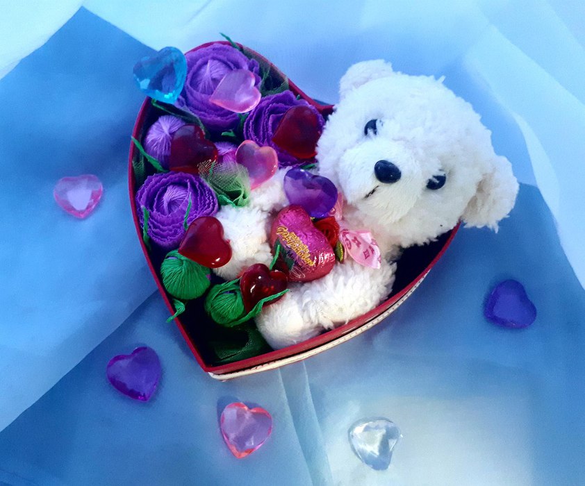 Отличный подарок, обязательно порадует и подарит атмосферу любви и нежности! В каждом цветочке сюрприз - вкусная конфетка! Мишка и все содержимое коробочки легко вынимается!