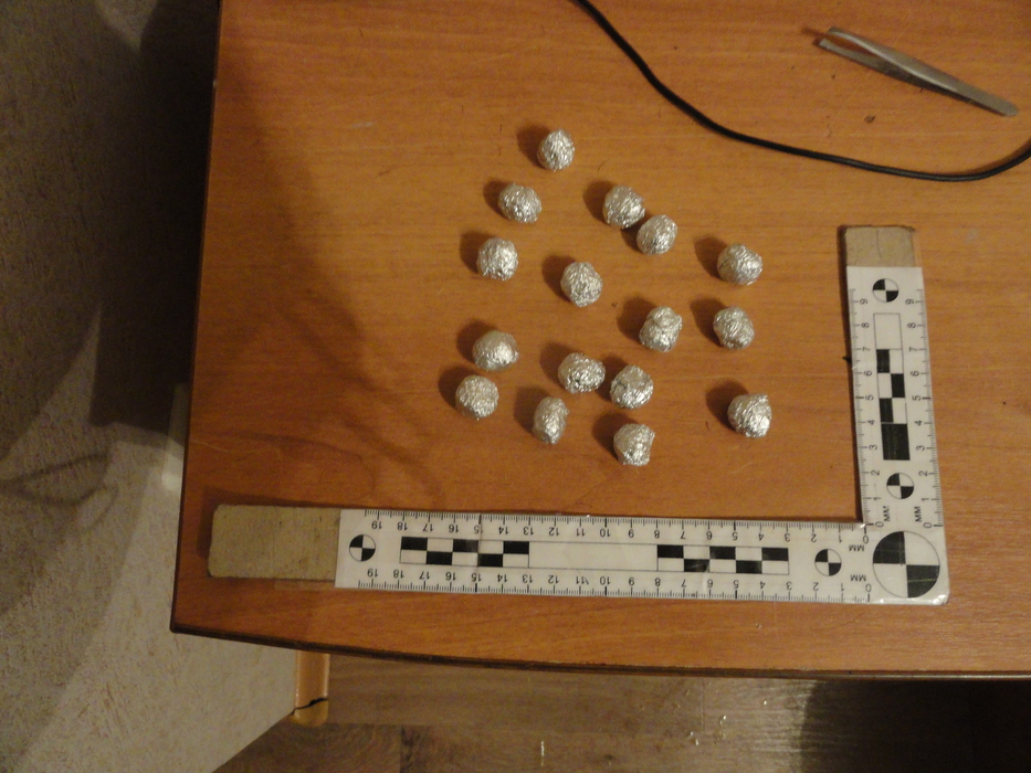 В ходе осмотра номера гостиницы, в котором проживал подозреваемый, оперативники обнаружили и изъяли шестнадцать фольгированных свертков с порошкообразным веществом светлого цвета внутри.