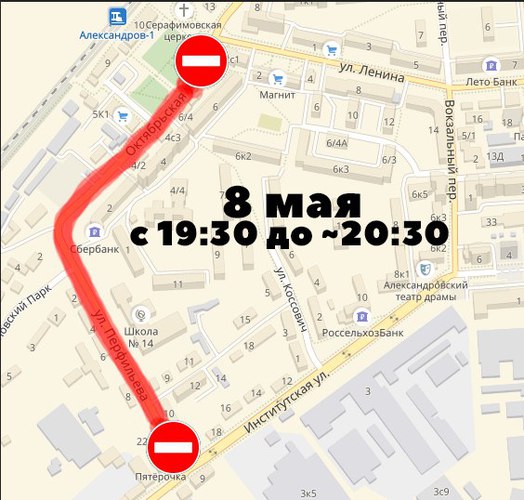 8 мая в 19.30 от МБОУ СОШ № 14 (ул. Перфильева) до Комсомольской площади (ООО «Трайтек») и до окончания мероприятия;