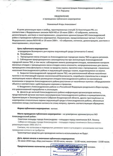 Уведомление от 18.05.2018 на проведение митинга 02 Июня 2018 года г. Александров