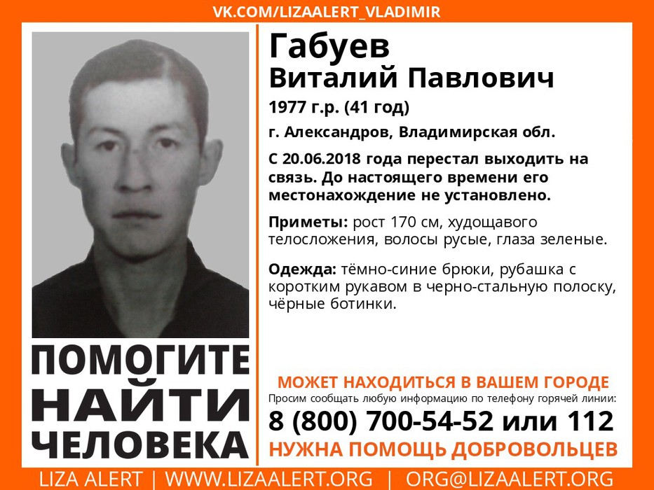 Пропал Габуев Виталий Павлович 1977 г.р. (41 год), г. Александров, Владимирская обл.