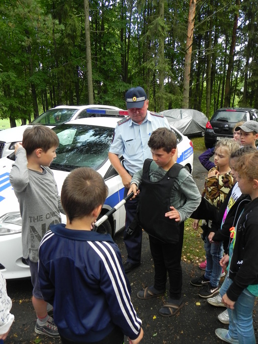 Пока старшие ребята состязались в интеллектуальной игре, девчонок и мальчишек из младших отрядов знакомили с работой инспекторов дорожно – патрульной службы ГИБДД. Ребятам показывали патрульный автомобиль инспектора ДПС, разрешили воспользоваться сигнально-говорящей установкой транспортного средства и спецсигналом, дали померить бронежилет, ну и конечно же посидеть в патрульном автомобиле.