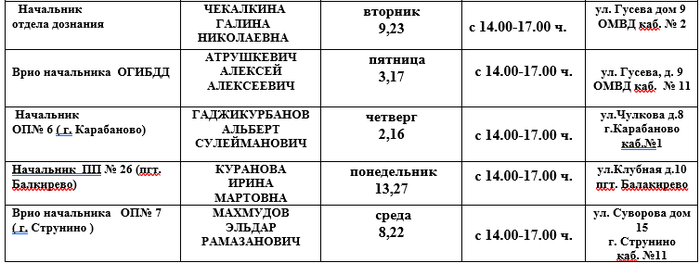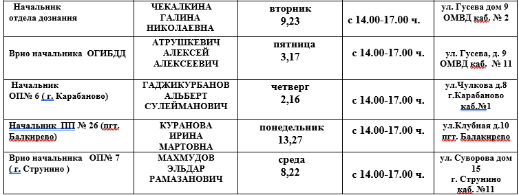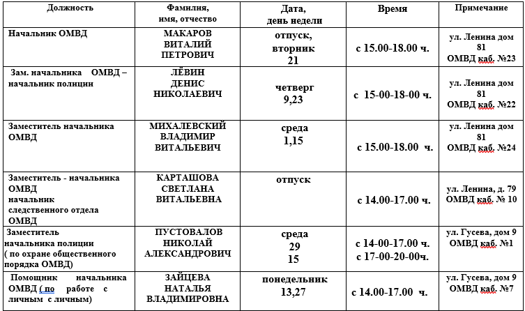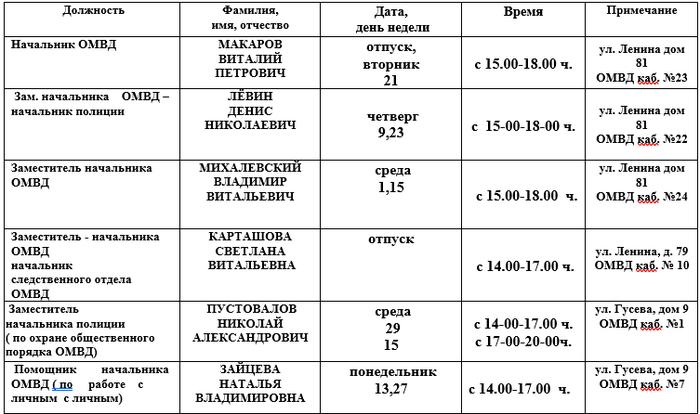 В выходные и праздничные дни прием граждан осуществляется ответственные от руководящего состава ОМВД.
