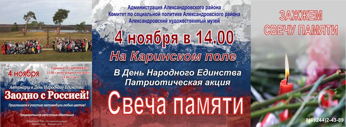 4 ноября, ежегодно, в ДЕНЬ НАРОДНОГО ЕДИНСТВА администрация Александровского района в лице Комитета по социальной политике, совместно с Александровским художественным музеем проводит патриотическую акцию "Свеча памяти" на территории мемориального комплекса "Каринское поле" близ села Большое Каринское. Уже по сложившейся традиции каждый год служится лития по воинам, отдавшим жизни за Отечество, зажигаются свечи... Участники акции возлагают к Поклонному кресту цветы и землю со святоотеческих мест. И этот год не исключение, 4 ноября в 14.00 акция "Свеча памяти" пройдет на Каринском поле. Присоединяйтесь!