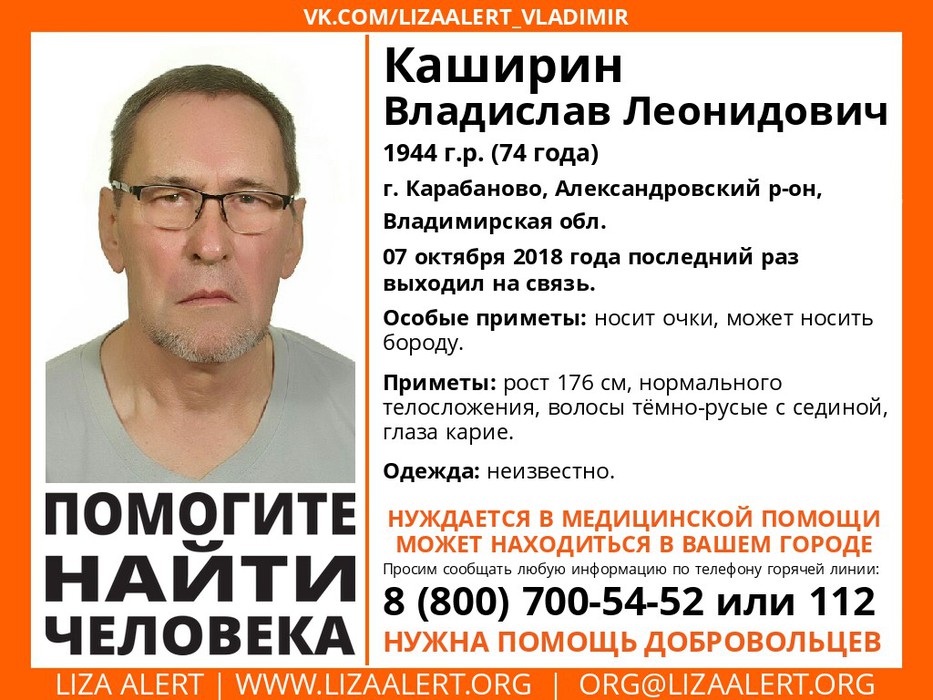 Пропал Каширин Владислав Леонидович 1944 г.р. (74 года), г. Карабаново, Александровский р-н, Владимирская обл.