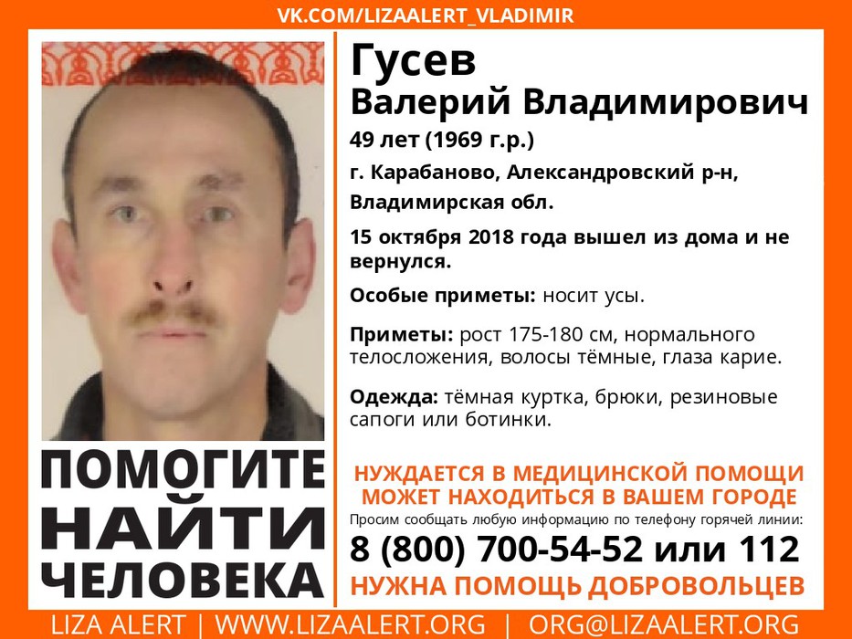 Пропал Гусев Валерий Владимирович 1969 г.р. (49 лет), г. Карабаново, Александровский р-н, Владимирская обл.