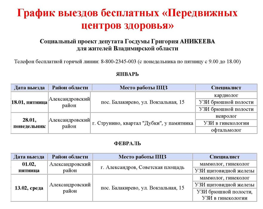 График выездов бесплатных "Передвижных центров здоровья" в Александровском районе