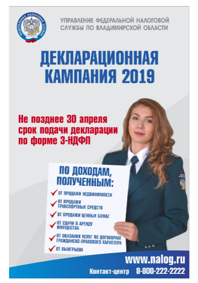 Межрайонная ИФНС России № 9 по Владимирской области напоминает, что до 30 апреля 2019 года граждане должны отчитаться о доходах, полученных в 2018 году. Представить декларацию необходимо, если в 2018 году налогоплательщик, к примеру, продал квартиру, которая была в собственности меньше минимального срока владения, получил дорогие подарки не от близких родственников, сдавал имущество в аренду или получал доход от зарубежных источников и др.