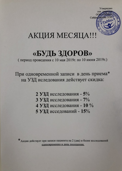 При прохождении 2-х УЗД исследований, ваша скидка составит 5%, при прохождении 3-х УЗД исследований- 7%, 4-х УЗД исследований - 10%, 5 УЗД исследований - 15%.