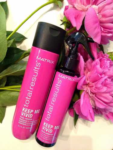 С наступлением лета спрос на яркое, трендовое окрашивание волос , в том числе в альтернативные оттенки, возрос многократно. Нас часто спрашивают - сколько продержится новый оттенок на волосах? Мы отвечаем: при правильном уходе - до 42 применений шампуня. Итак, разберемся, что такое правильный уход. Во-первых мыть волосы необходимо в прохладной воде. Горячая вода раскрывает, разрыхляет кутикулу волоса, вымывая пигмент. Во-вторых, необходимо использовать только профессиональные средства по уходу за окрашенными волосам, такие, например, как продукты серии Keep me vivid для глазурирования цвета от MATRIX, специально созданной для сохранения первозданного сияния волос, окрашенных в яркие  и быстро вымывающиеся оттенки. В-третьих, необходимо использовать дополгнительные продукты для защиты волос от УФ-излучения, масла или специальные спреи.
