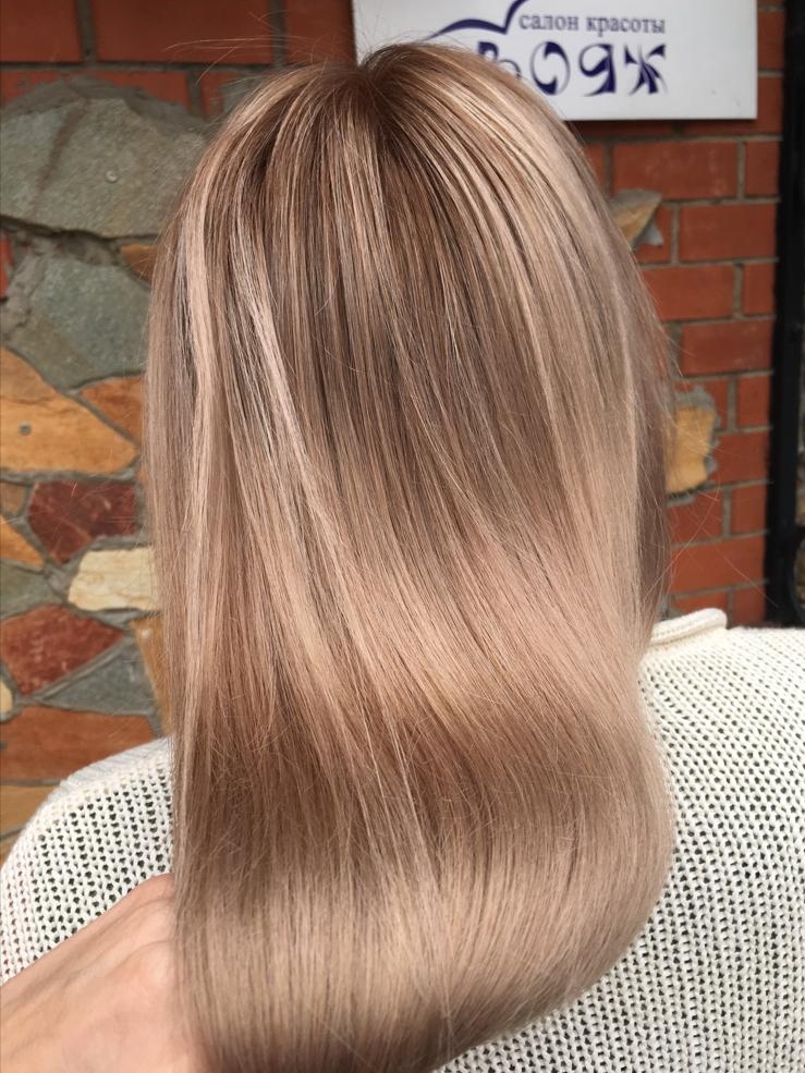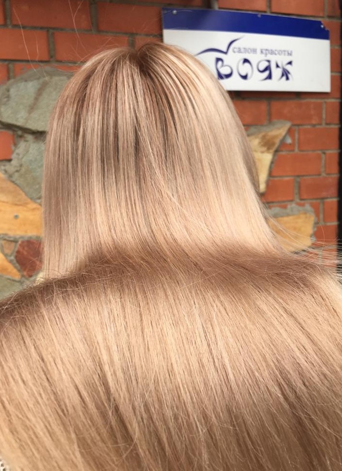 Великолепная работа колористов центра красоты ВОЯЖ. Исправление цвета (до - темная корневая зона, отросшая за несколько недель и яркий желтый блонд) в один прием. Результат: красивый карамельный оттенок  с нюансами розового кварца, живой и теплый.